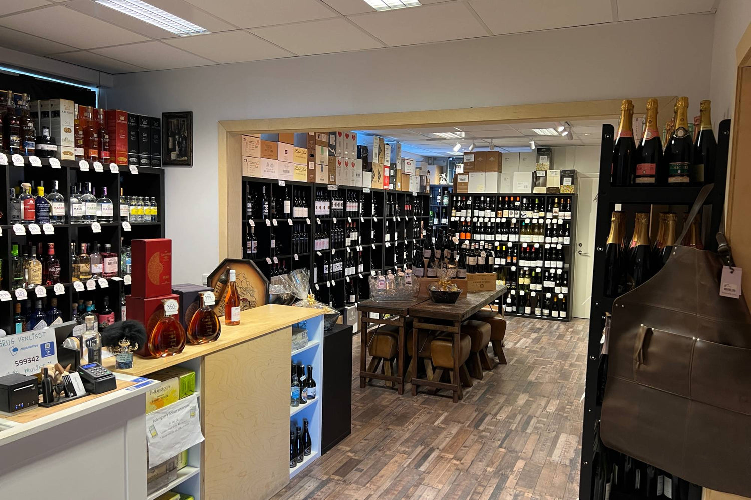 Vi har altid et stort udvalg på hylderne med omkring 55 forskellige gin, 85 varianter af rom og 138 typer whisky.